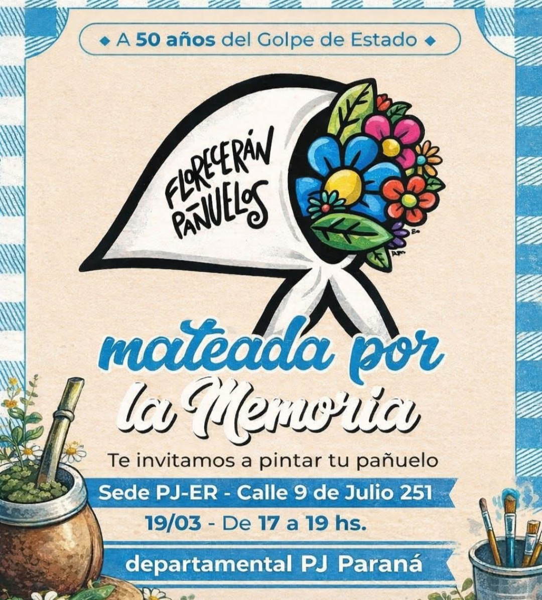 En el marco de cumplirse 50 años del Golpe de Estado cívico-militar en Argentina, el Partido Justicialista de Paraná invita a participar de una Mateada por la Memoria para reafirmar y profundizar el compromiso con los derechos humanos, construyendo desde el diálogo y el encuentro.