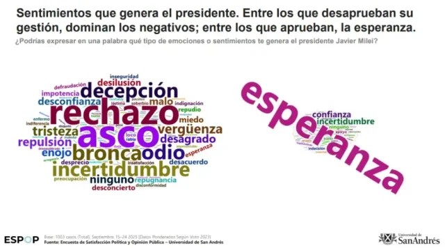 “Asco”, “rechazo” y “decepción”, son los sentimientos más recurrentes entre los detractores de Milei, mientras que quienes lo apoyan aún plantean su sensación de “esperanza” en el desempeño del “libertario”.