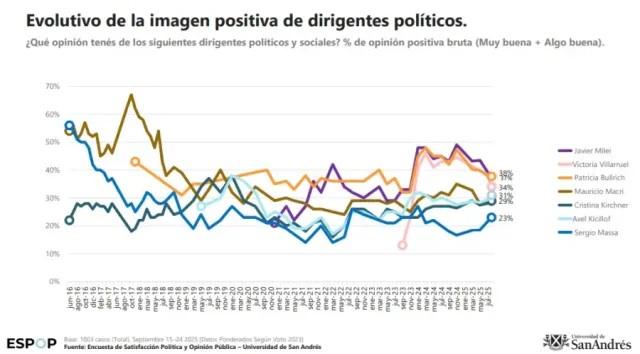 Javier Milei ya no es el político con mejor imagen (tiene el 37 %), sino que es su ministra de Seguridad Patricia Bullrich la que mejor mide a nivel nacional (38 %). Les siguen la vicepresidenta Victoria Villarruel, con una imagen positiva del 34 %, aunque solo la ven como “muy buena” el 7 % de ese total.