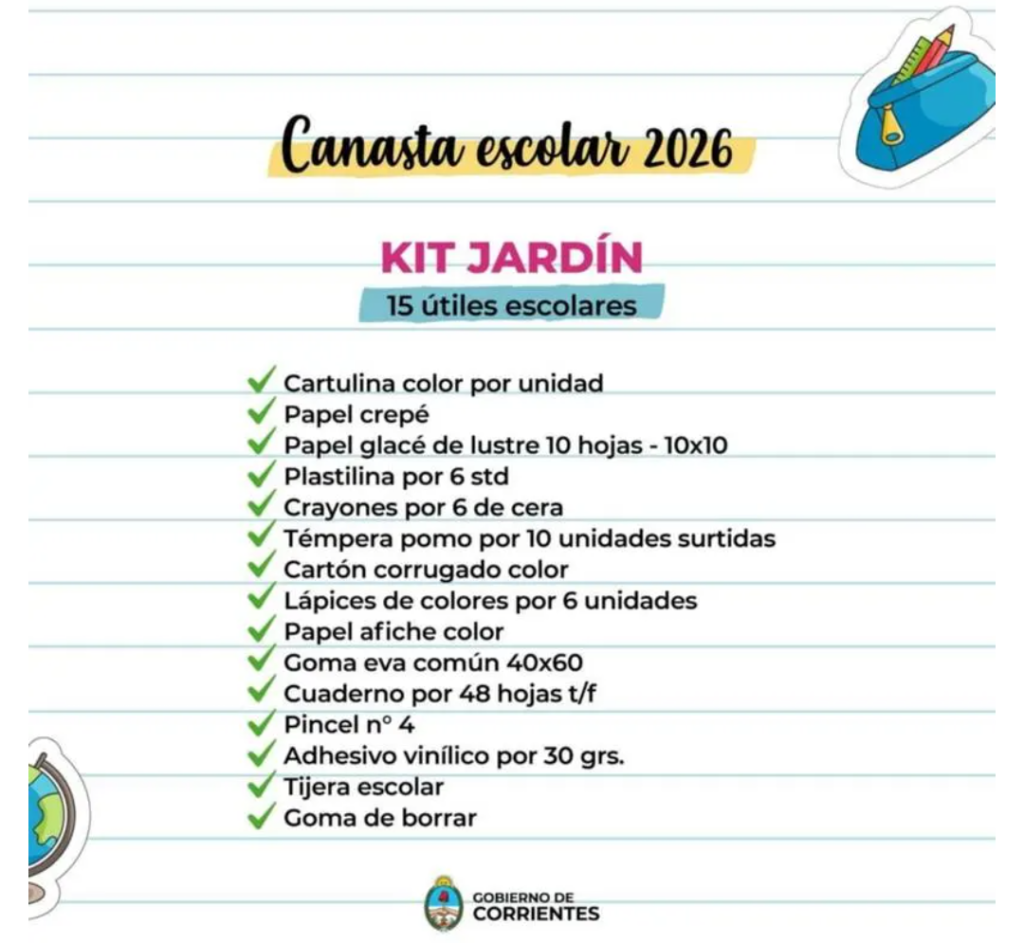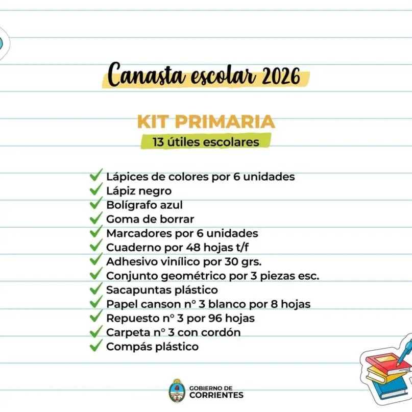 El Gobierno de Corrientes lanzó la Canasta Escolar 2026, que en esta edición mantendrá los precios de 2025 para los kits de niveles primario y secundario, en tanto que para el Kit escolar aplicará un 28% de descuento en los precios.
