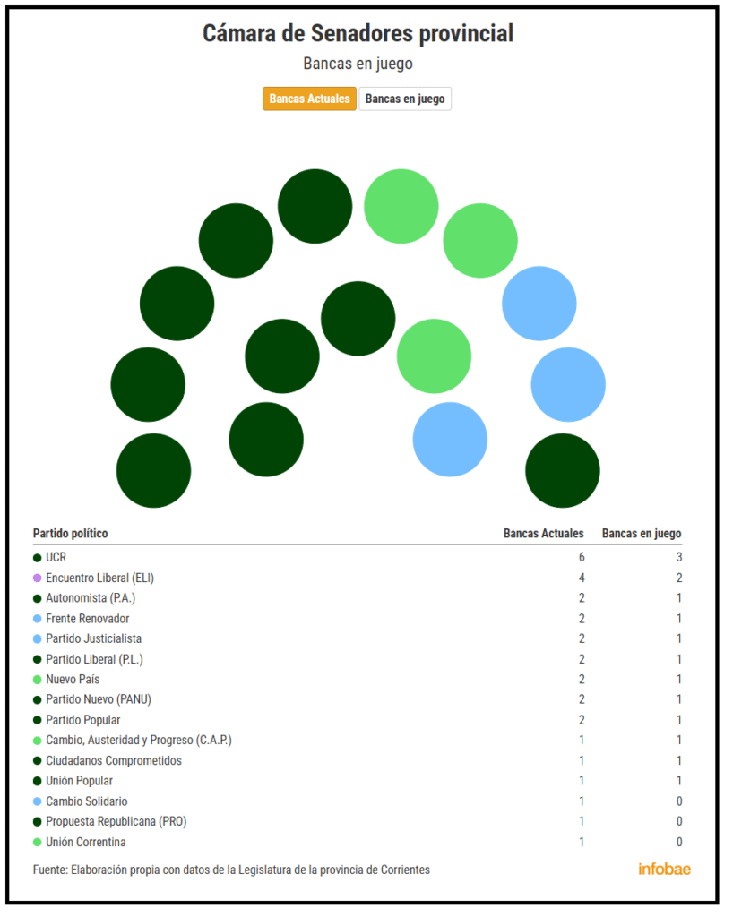 Corrientes tiene una Legislatura bicameral que renueva mañana la mitad de la Cámara baja y un tercio del Senado. Se eligen 15 bancas para diputados y 5 para senadores provinciales. Compiten 8 listas, una más que para gobernador. También se votan 73 intendentes (entre ellos el de la Capital), y concejales.