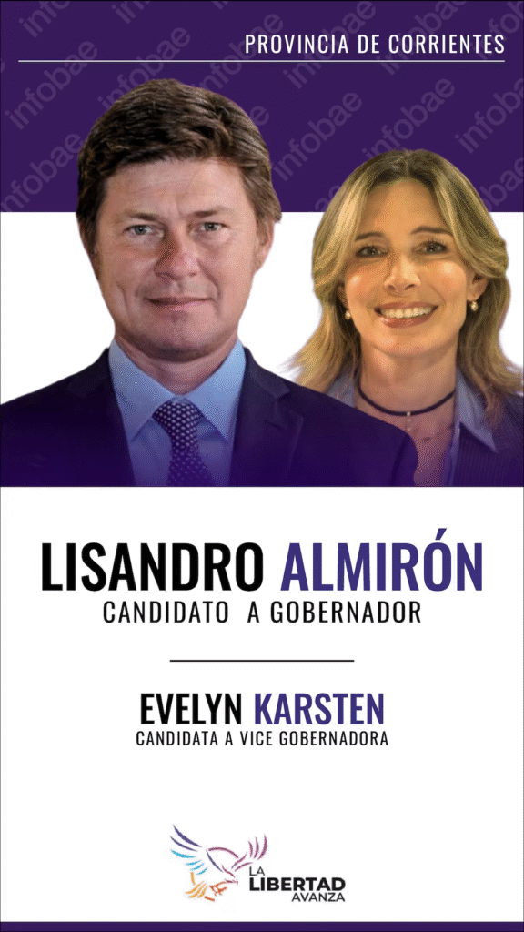 Más rezagado, se ubicaría el diputado nacional de La Libertad Avanza Lisandro Almirón, candidato oficial del mileísmo. Se presenta secundado en la boleta por Evelyn Karsten, secretaria parlamentaria de la Cámara de Diputados de la Nación.
