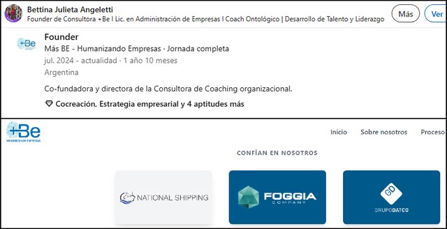 Ante la pregunta sobre a qué se dedica la esposa del exvocero, la respuesta más elemental describe la ocupación de “coach ontológica”. Así se define ella también, aunque la calificación oculta un dato esencial: como informó TeleNueve DenunciaBettina Angeletti es co–fundadora y directora de MasBE, una “consultora integral de coaching organizacional” que trabaja con otras compañías de índole diversa. En la página web de la firma, la empresaria figura como única autoridad y es destacada por su “vasta trayectoria en la gestión empresarial y de recursos humanos”.