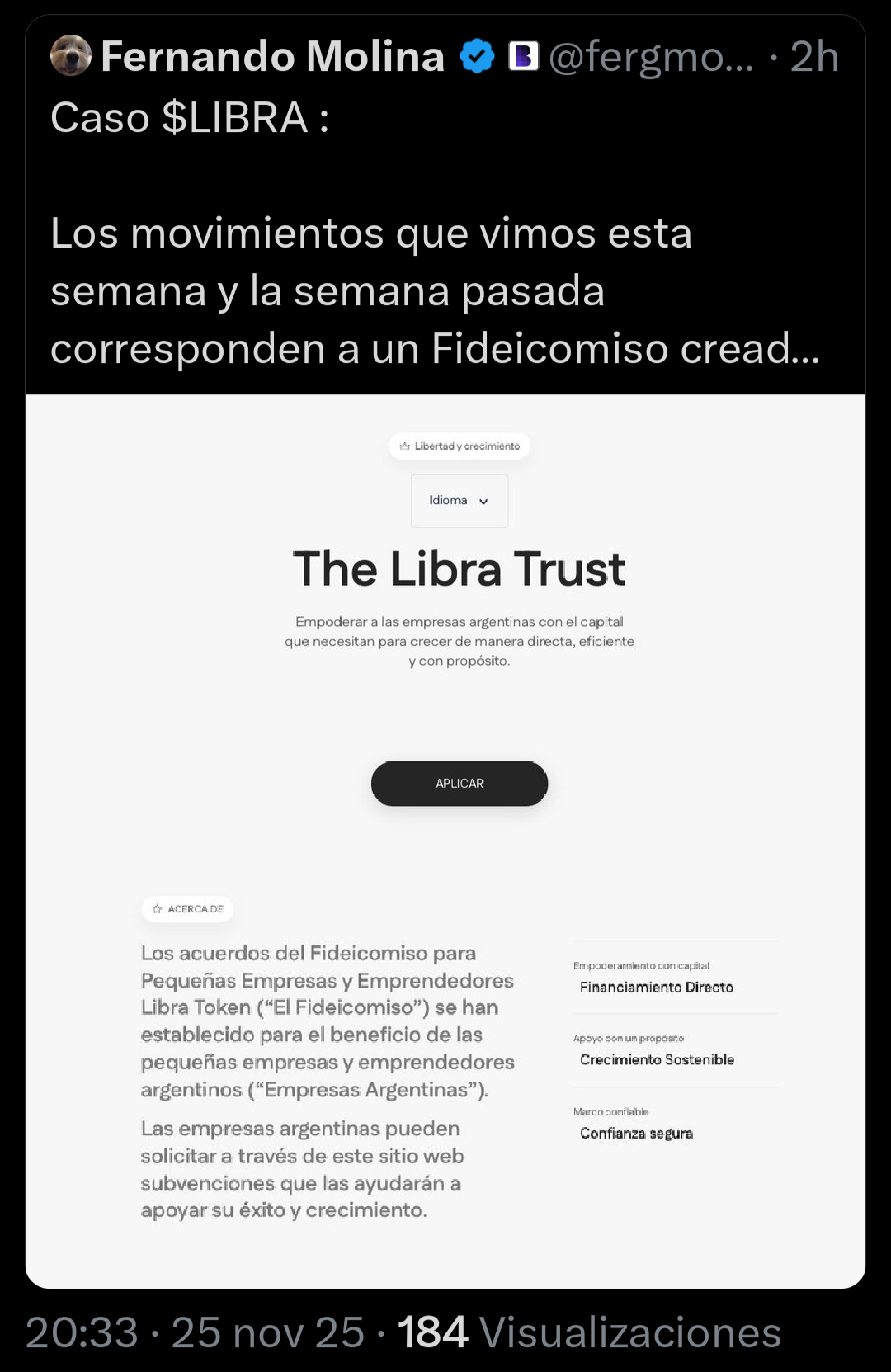 «Nunca existió un proyecto de inversión para las Pymes , Milei promovió una estafa que perpetraron los que hoy siguen moviendo millones de $LIBRA», subrayó para finalizar diciendo: «Y la justicia argentina? Bien, gracias».