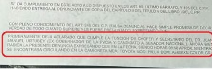 La denuncia penal fue radicada horas más tarde en la Comisaría N° 101 de San Lorenzo, por Carlos María García Bes, chofer y secretario de Urtubey, quien manejaba la Toyota Hilux color gris, perteneciente a “Frigorífico del NOA S.A.”, empresa cuyo titular es el propio exgobernador.