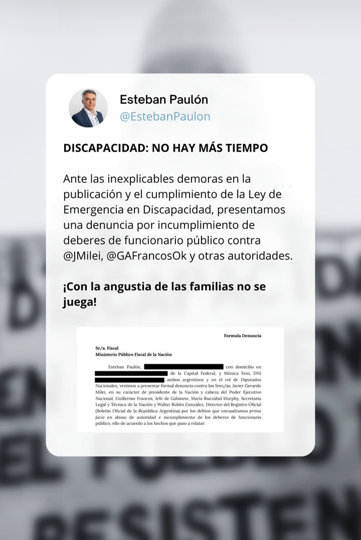 El presidente Javier Milei y el jefe de gabinete Guillermo Francos fueron denunciados en Comodoro Py por la demora en la promulgación y reglamentación de la ley de emergencia en discapacidad (27.739).