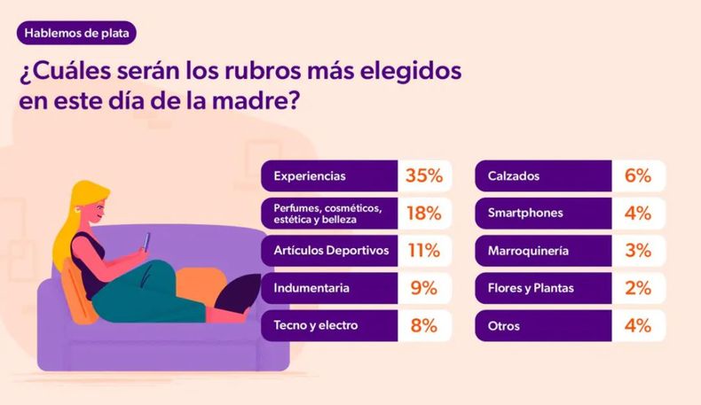 Entre los rubros más elegidos para la compra de regalos se destacan: Experiencias (cenas, desayunos a domicilio, spa) con el 35%, seguido por Perfumería, Cosmética y Belleza (18%), Artículos Deportivos (11%), Indumentaria (9%), Tecnología y electrodomésticos (8%), Calzado (6%) y Smartphones (4%). En menor medida aparecen Marroquinería (3%), Flores y plantas (2%), Bijouterie, relojería y bazar (3%), Lencería y blanco (1%).