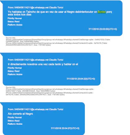 Hay mensajes que dan cuenta de una relación más cercana. El 7 de mato de 2017, Claudio Tórtul le dijo a su hermano: “M voy cn la mujer de bordet y taincho a ver una quinta. Si da tenemos q comprarla alquilarsela cara. Y encarar otro tipi de relacion. Tenemos q acelerar. Lis proximos 3 anos hagamos plata enserio y nos retiramos”.