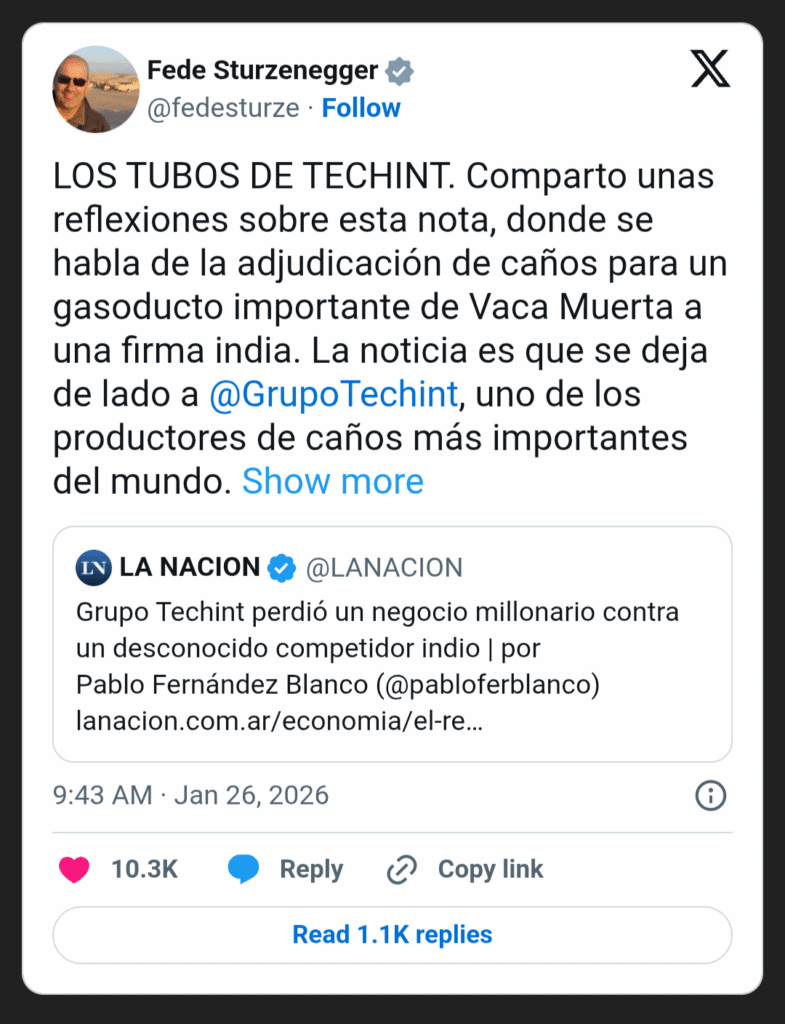 El que prendió la mecha fue el ministro de Desregulaciones Federico Sturzenegger. En un polémico descargo en la red X exTwitter, sostuvo que Techint ofreció los caños “un 40 por ciento más caros” que su contraparte en la compulsa, y también remarcó que la multinacional de Rocca no debía tener prioridad para mejorar su oferta.