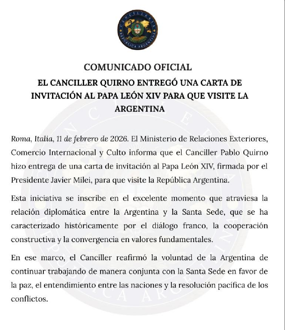 La invitación fue suscripta por el presidente Javier Milei y entregada en el Vaticano por el canciller Pablo Quirno, en el marco de lo que se describió como un “excelente momento” en la relación diplomática entre la Argentina y la Santa Sede.