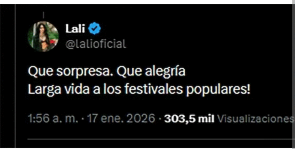 La cantante Lali Espósito sumó un nuevo capítulo a la polémica al ironizar sobre la presencia del presidente Javier Milei en el Festival de Jesús María, en Córdoba, donde el mandatario subió al escenario y cantó junto al Chaqueño Palavecino.