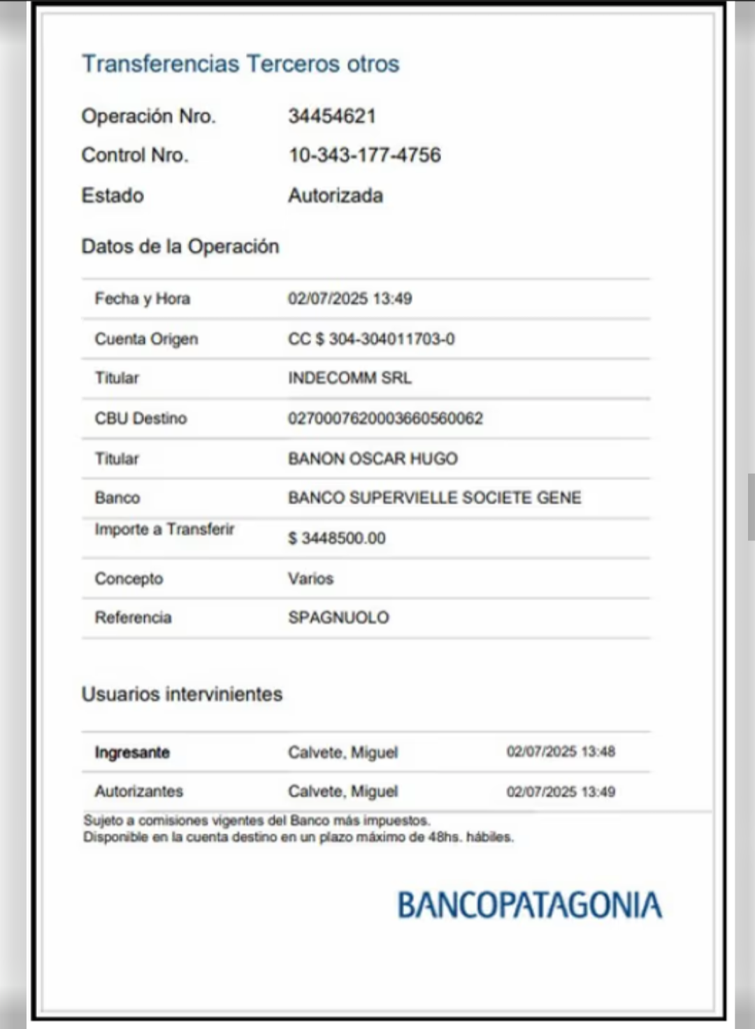 *“Con fechas 11 de junio, 2 de julio y 8 de agosto de 2025, Calvete saldó la deuda contraída por el funcionario con su mueblero, Oscar H. Banon, mediante el pago de la suma de un millón quinientos mil pesos ($1.500.000), tres millones cuatrocientos cuarenta y ocho mil pesos ($3.448.000) y cinco millones veintiún mil quinientos pesos ($5.021.500), respectivamente, a través de la cuenta bancaria correspondiente a la empresa Indecomm SRL”.