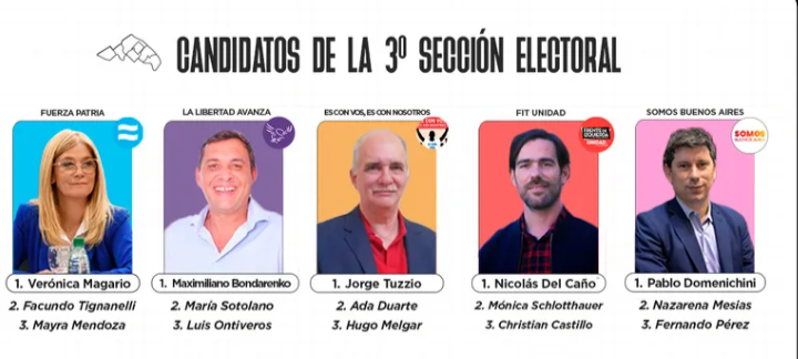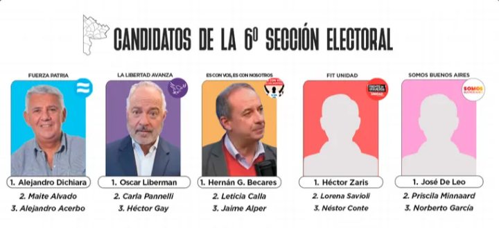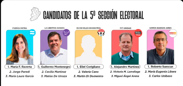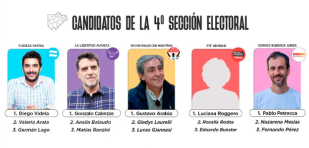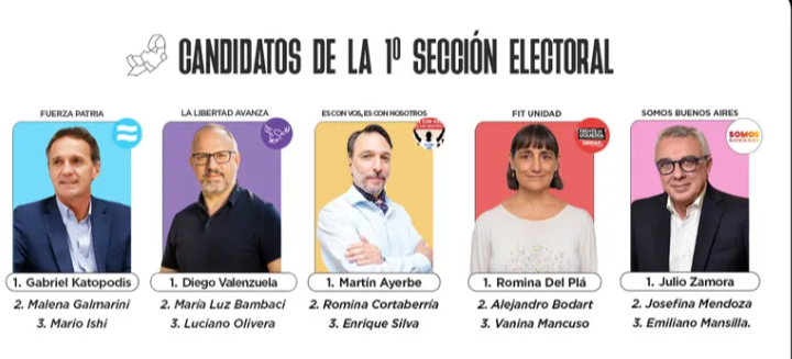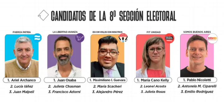 Principales candidatos: Fuerza Patria: Diego Videla. La Libertad Avanza: Gonzalo Cabezas. Es con vos: Gustavo Arabia. Somos Buenos Aires: Pablo Petrecca. Potencia: Andrea Passerini.