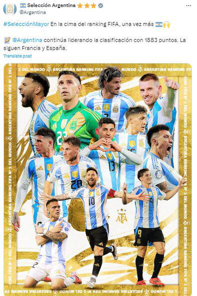 La Selección argentina de fútbol reafirmó su posición de liderazgo en el ranking FIFA, ocupando el primer lugar desde abril 2023. Con un total de 1883.50 puntos, Argentina se mantiene a la cabeza, seguida por Francia y España.