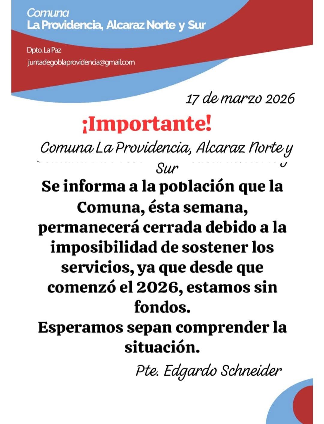 La crisis tuvo en las últimas horas un hecho que encendió todas las alarmas. La Comuna de La Providencia, en el departamento La Paz, anunció el cierre temporal de sus puertas por falta de fondos.