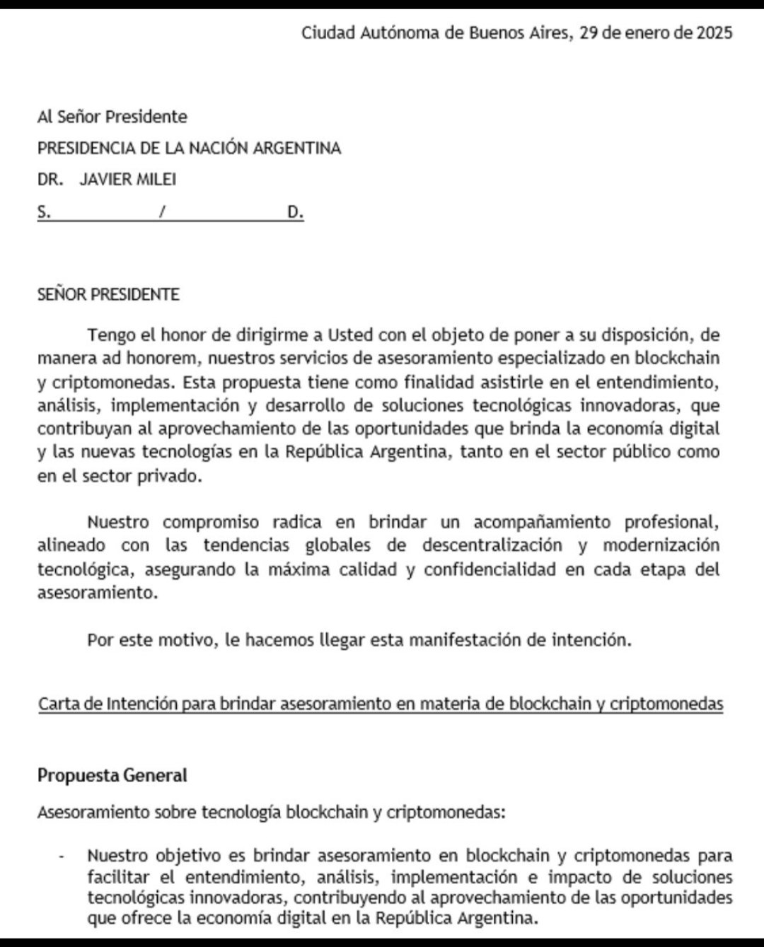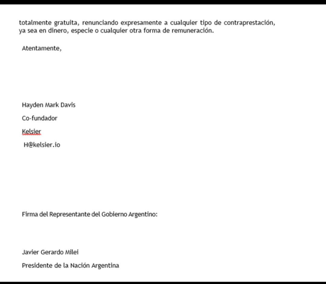 El documento recuperado corresponde a una carta de intención, conocida como LOI por sus siglas en inglés. En el archivo figura Davis como remitente y Milei como destinatario.