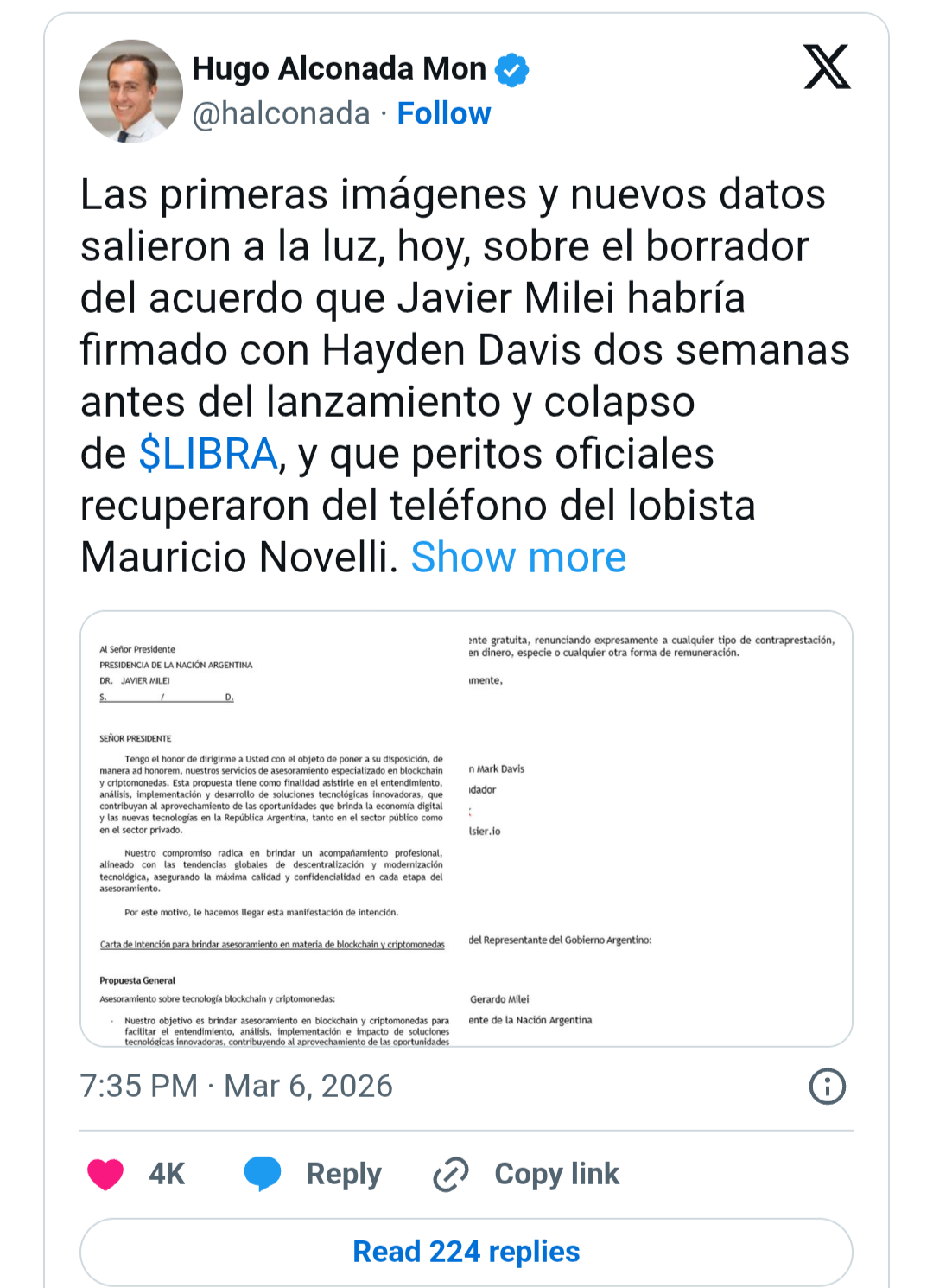 El legislador Maximiliano Ferraro sostuvo que existen documentos que «dan cuenta del negocio millonario que organizó con Hayden Davis, con Milei como pieza fundamental para hacer negocios privados aprovechando su investidura y función pública».