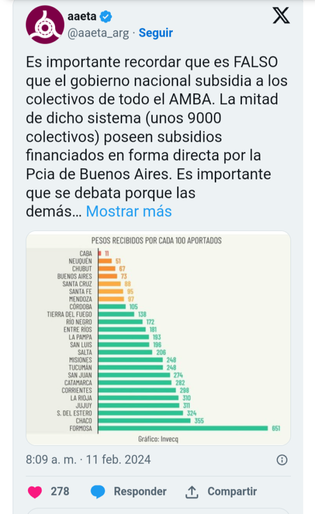 Al respecto, a través de su cuenta de X indicaron que “es importante recordar que es falso que el gobierno nacional subsidia a los colectivos de todo el AMBA” y detallaron que “la mitad de dicho sistema (unos 9.000 colectivos) poseen subsidios financiados en forma directa por la provincia de Buenos Aires”.