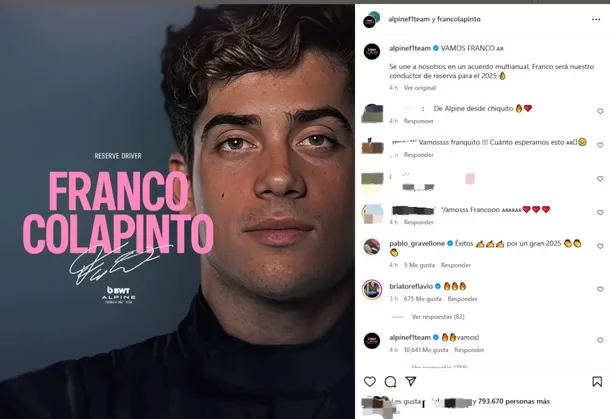 La escudería francesa sorprendió al publicar un mensaje en español en honor a Colapinto, algo que llamó la atención de los seguidores y generó una interacción directa con el piloto. «Qué rápido aprendieron castellano, che», comentó Franco, a lo que la cuenta oficial de la escudería respondió: «Todo por vos».