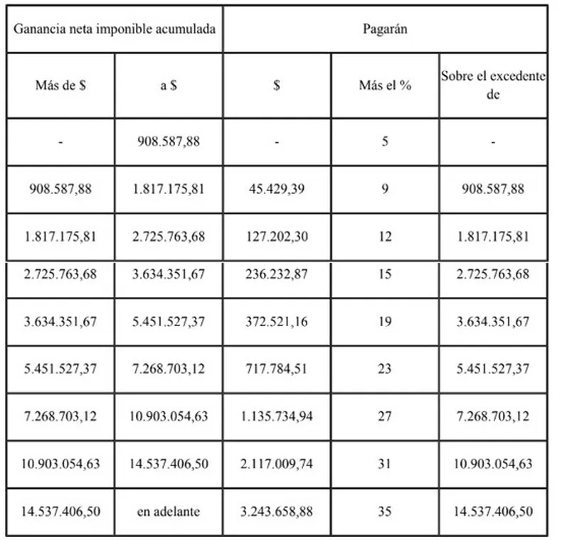 Según establece el texto, los trabajadores que ganen más de $908.587,88 netos quedarán alcanzados por el Impuesto a las Ganancias, con alícuotas progresivas de entre 5% y 35%.