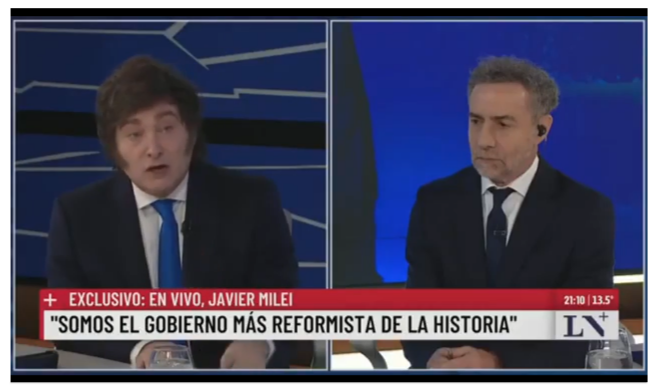 En medio de la entrevista, Milei expresó algo gravísimo en términos de actos inconstitucionales. Su intromisión como jefe de Estado en el Poder Judicial para obtener un resultado judicial condenatorio hacia la líder del principal espacio político de la oposición.