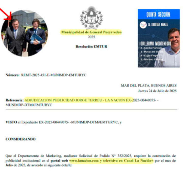 Documentos oficiales del Ente Municipal de Turismo y Cultura (EMTURYC) de General Pueyrredón revelan que el municipio destinó $104.070.286 a la empresa Jorge Terré S.A. para la contratación de espacios publicitarios en La Nación+.