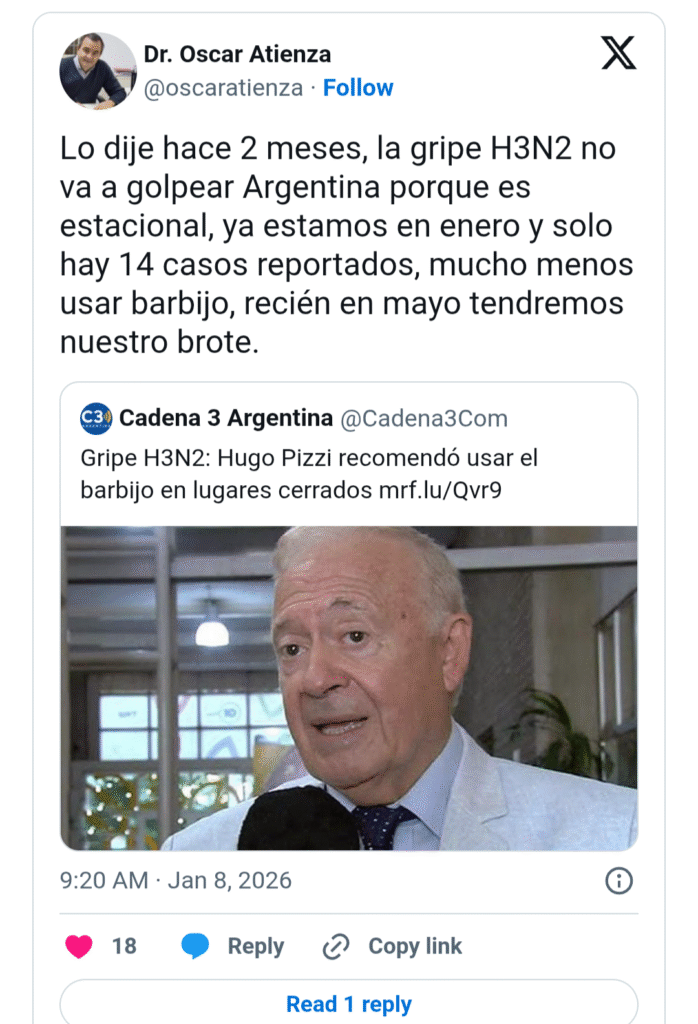 Atienza recordó que la H3N2 está incluida en la carta de vacunación y subrayó: «Con vacunarse alcanza para cuidarse», estimando que en Argentina la enfermedad podría impactar a partir de mayo, con la llegada del frío.