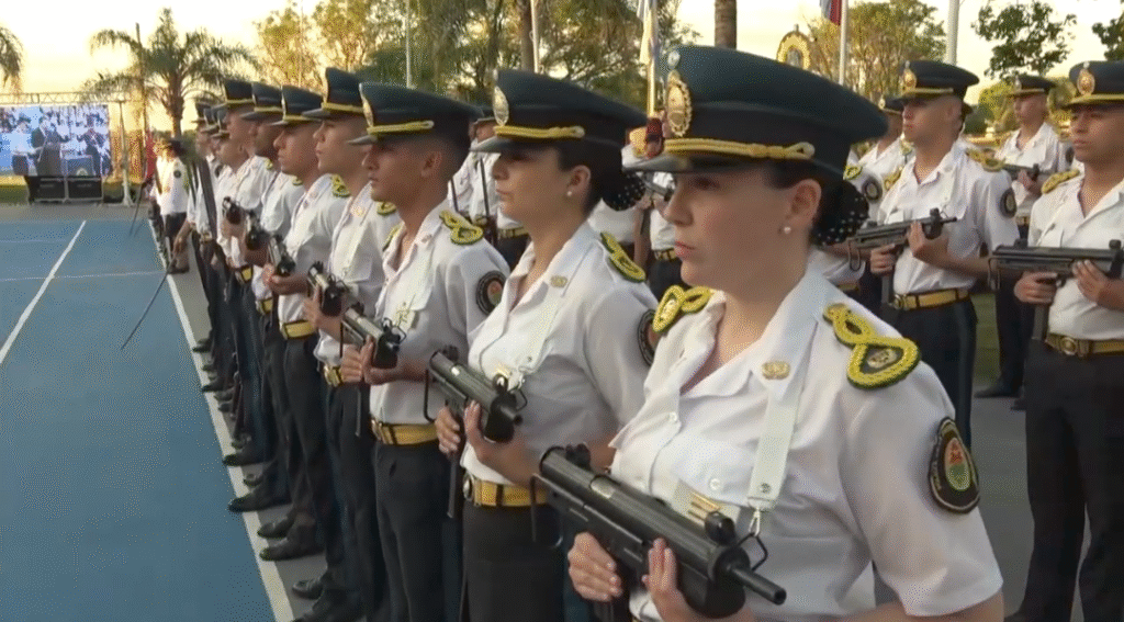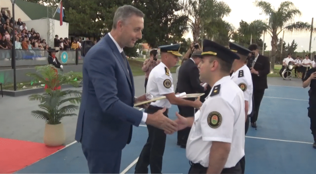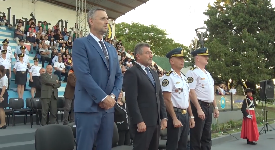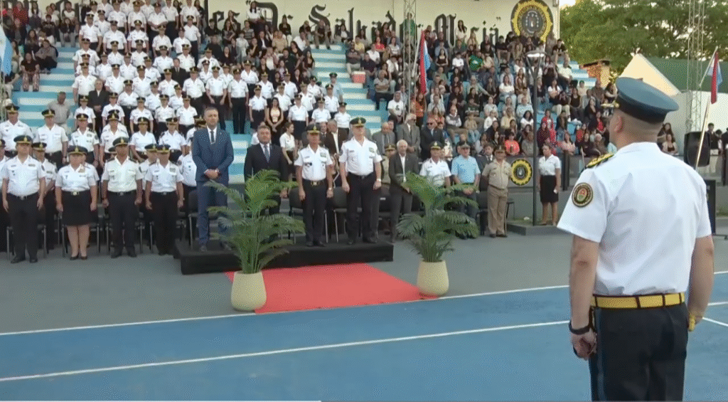 El acto de finalización del Ciclo Lectivo 2025 de la División Escuela Superior de Oficiales ‘Dr. Salvador Maciá’, en el que más de 400 agentes terminaron su formación, estuvo encabezado por el ministro de Seguridad y Justicia, Néstor Roncaglia, el presidente de la Cámara de Diputados, Gustavo Hein, el jefe de Policía de la Provincia, Comisario General Claudio González y el sub jefe de la Policía, Comisario General, Marcelo Clausich.