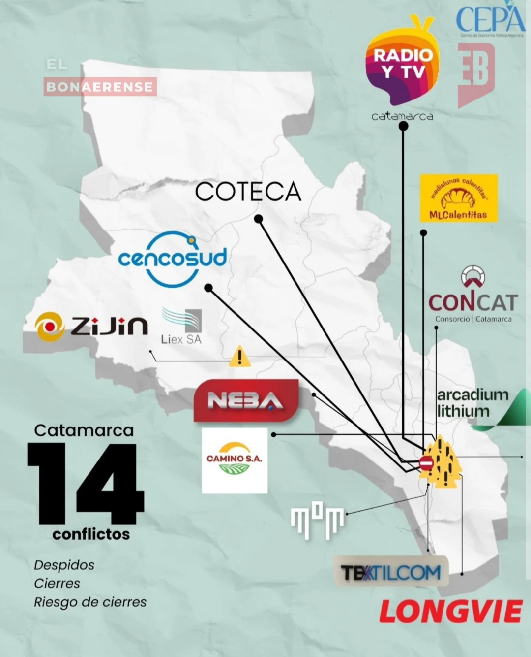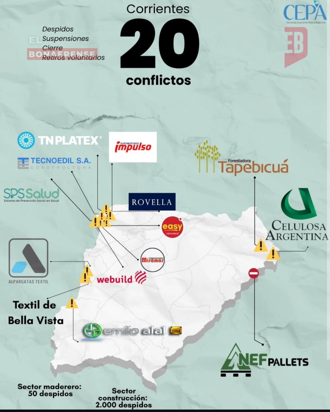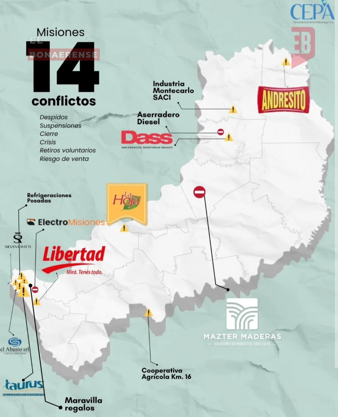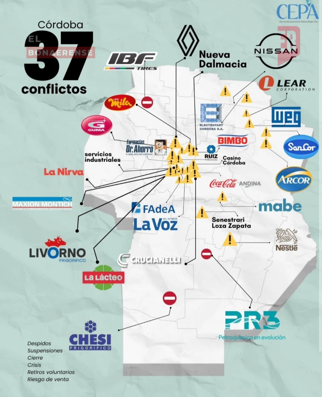 El relevamiento expone una sucesión de despidos, suspensiones, cierres, quiebras y crisis productivas que afectan a industrias, comercios y servicios. Las situaciones van desde reducciones de personal hasta el cierre definitivo de establecimientos, configurando un cuadro de tensión sostenida en el mercado de trabajo.
