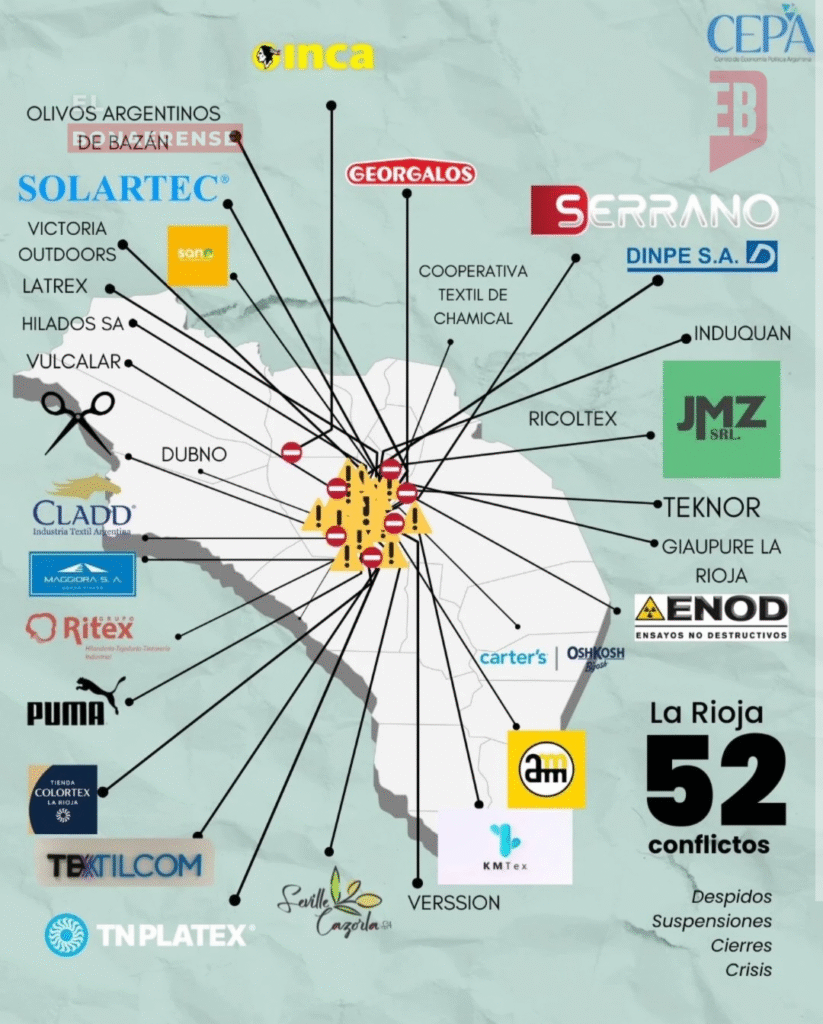 En el norte argentino, La Rioja presentó 52 casos, con fuerte impacto en el sector textil e industrial. Tucumán (22), Salta (19) y Jujuy (8) mostraron un escenario combinado de despidos, suspensiones y cierres parciales o definitivos. A estos distritos se suman Catamarca (14) y Santiago del Estero (5).