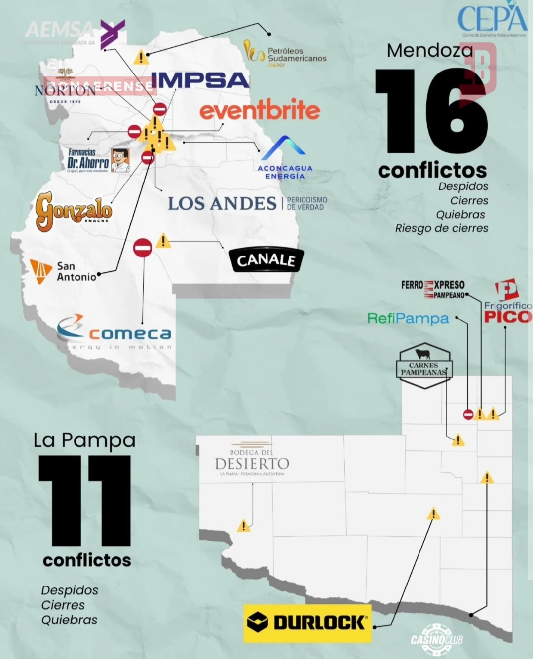 En la región de Cuyo y el centro del país, Mendoza registró 16 conflictos, San Juan 13 y La Pampa 11, con empresas que enfrentaron quiebras, cierres y ajustes de personal.
