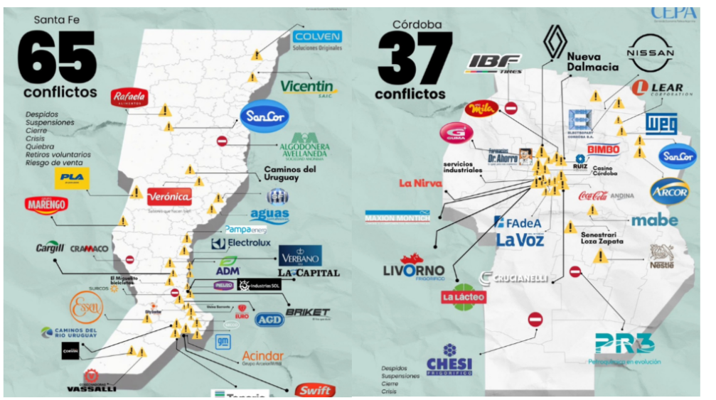 Santa Fe contabilizó 65 episodios vinculados a dificultades financieras y productivas que derivaron en suspensiones, despidos y cierres. En tanto, Córdoba sumó 38 conflictos que afectaron tanto a compañías de servicios como a sectores vinculados al turismo y la infraestructura.