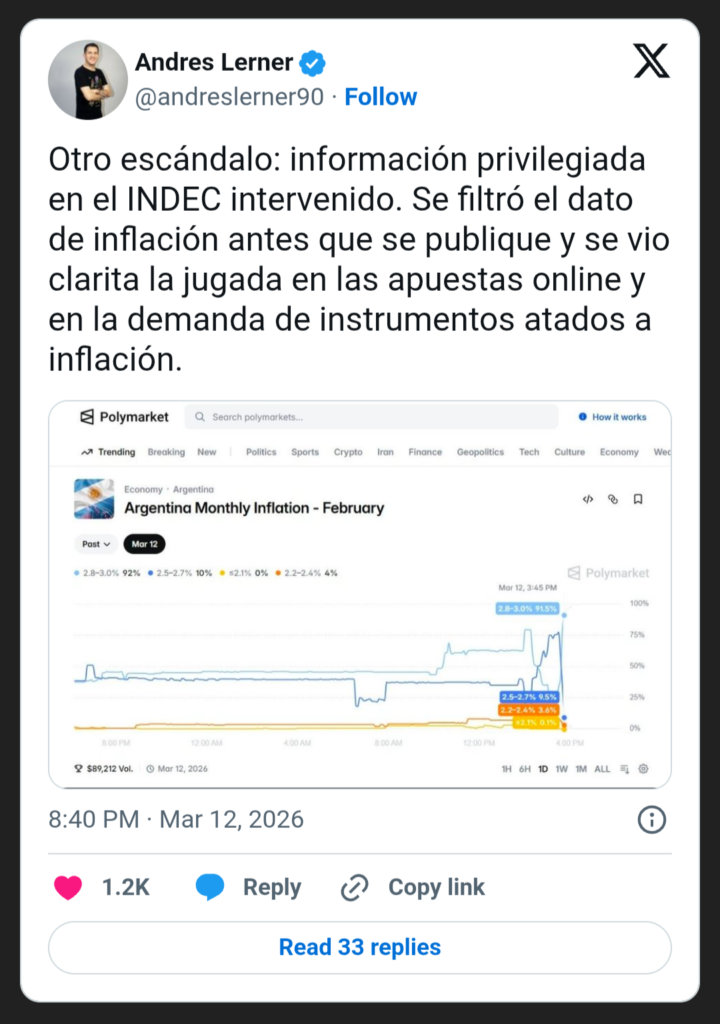 Por si esto fuera poco, trascendió la denuncia sobre una posible filtración de información privilegiada en torno a cuánto daría el IPC del mes, que impactó en las apuestas online y la demanda de instrumentos atados a la inflación. El rango de entre 2,8% y el 3% tuvo un salto en los 15 minutos previos a que se conociera el índice que llevó las operaciones en ese rango al 92% del total.