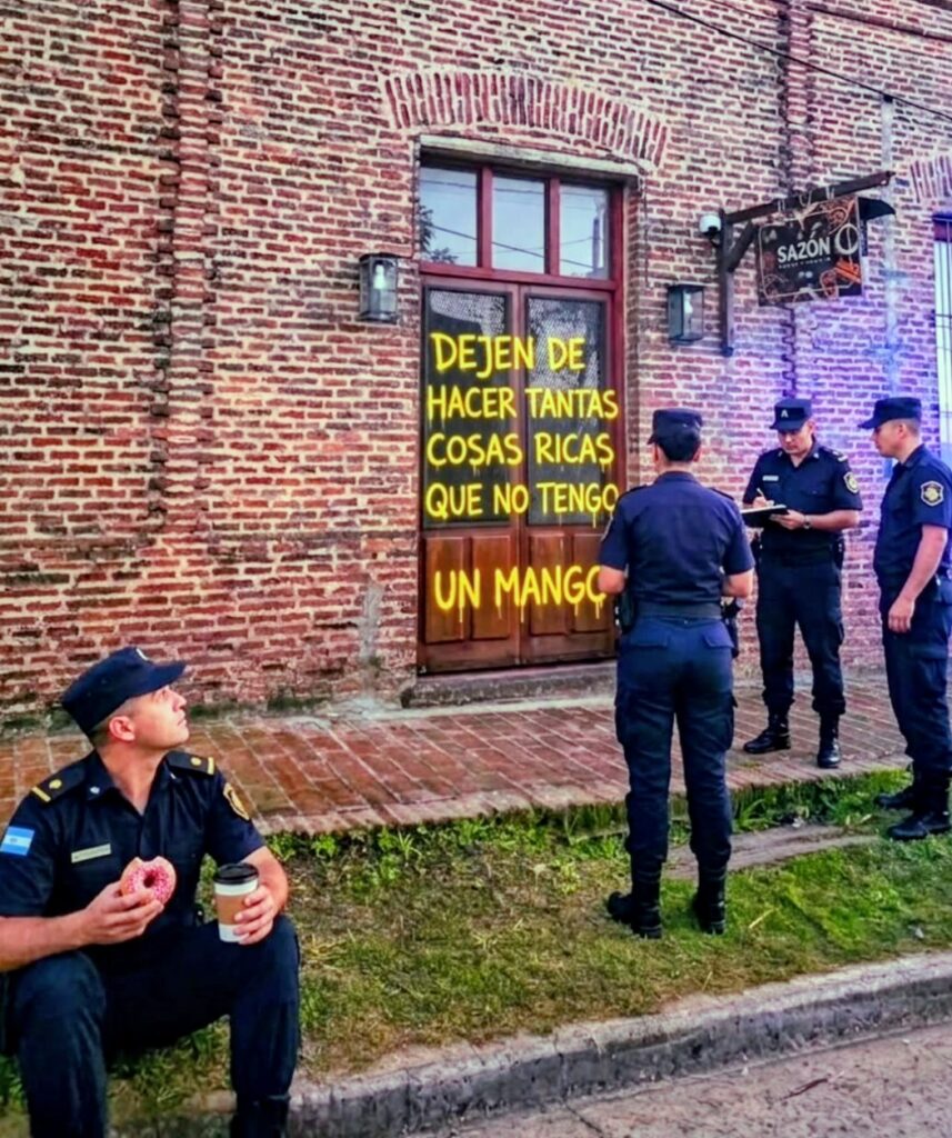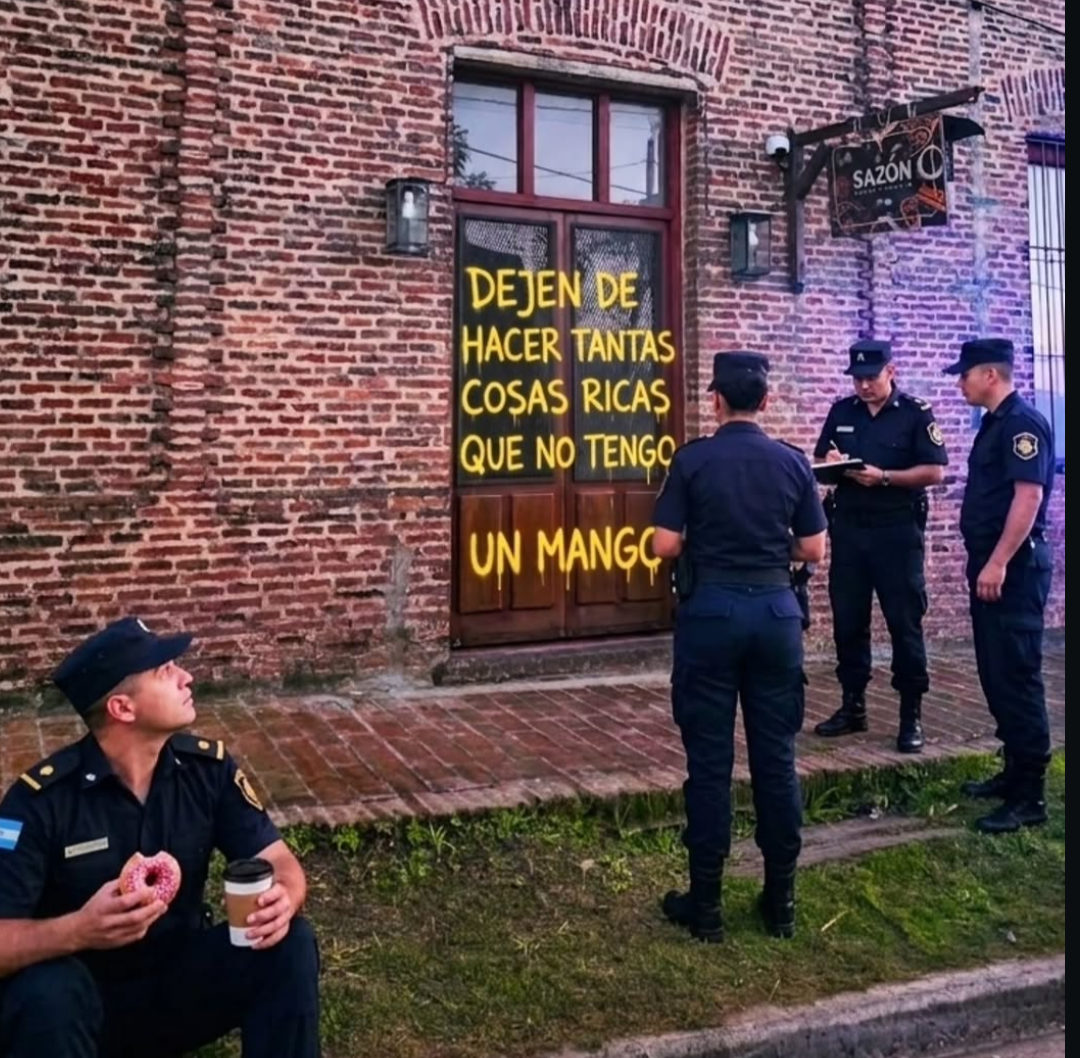 La escena se completa con policías “tomando intervención”, aunque uno de ellos aparece sentado, café en mano y comiendo una dona, lo que rápidamente desactiva cualquier dramatismo.
