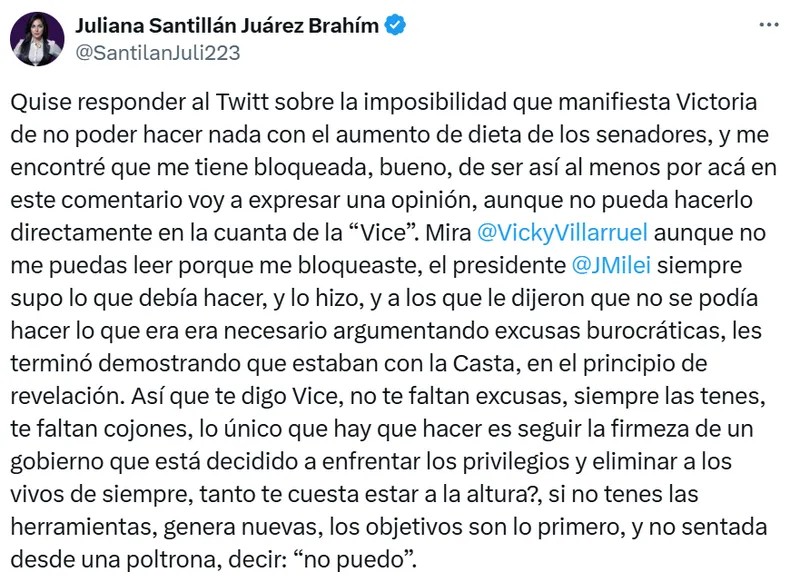 «Quise responder al twitt sobre la imposibilidad que manifiesta Victoria de no poder hacer nada con el aumento de dieta de los senadores, y me encontré que me tiene bloqueada. Bueno, de ser así al menos por acá en este comentario voy a expresar una opinión», sostuvo la legisladora en su cuenta de X.