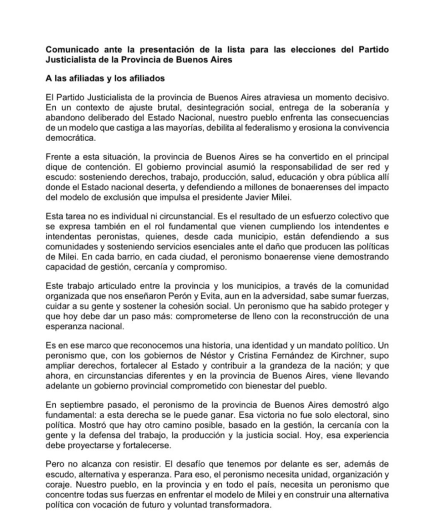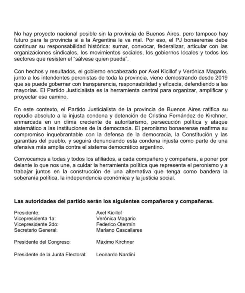 La confirmación oficial llegó este sábado al mediodía con el primer comunicado conjunto del nuevo PJ bonaerense. En él, cada espacio dejó su marca. El MDF logró incorporar la mirada del Gobierno bonaerense como escudo y red frente a las deserciones del Estado nacional, y el kirchnerismo metió su reclamo permanente por la libertad de CFK. Al final del comunicado se informan las nuevas autoridades. A continuación el texto completo: