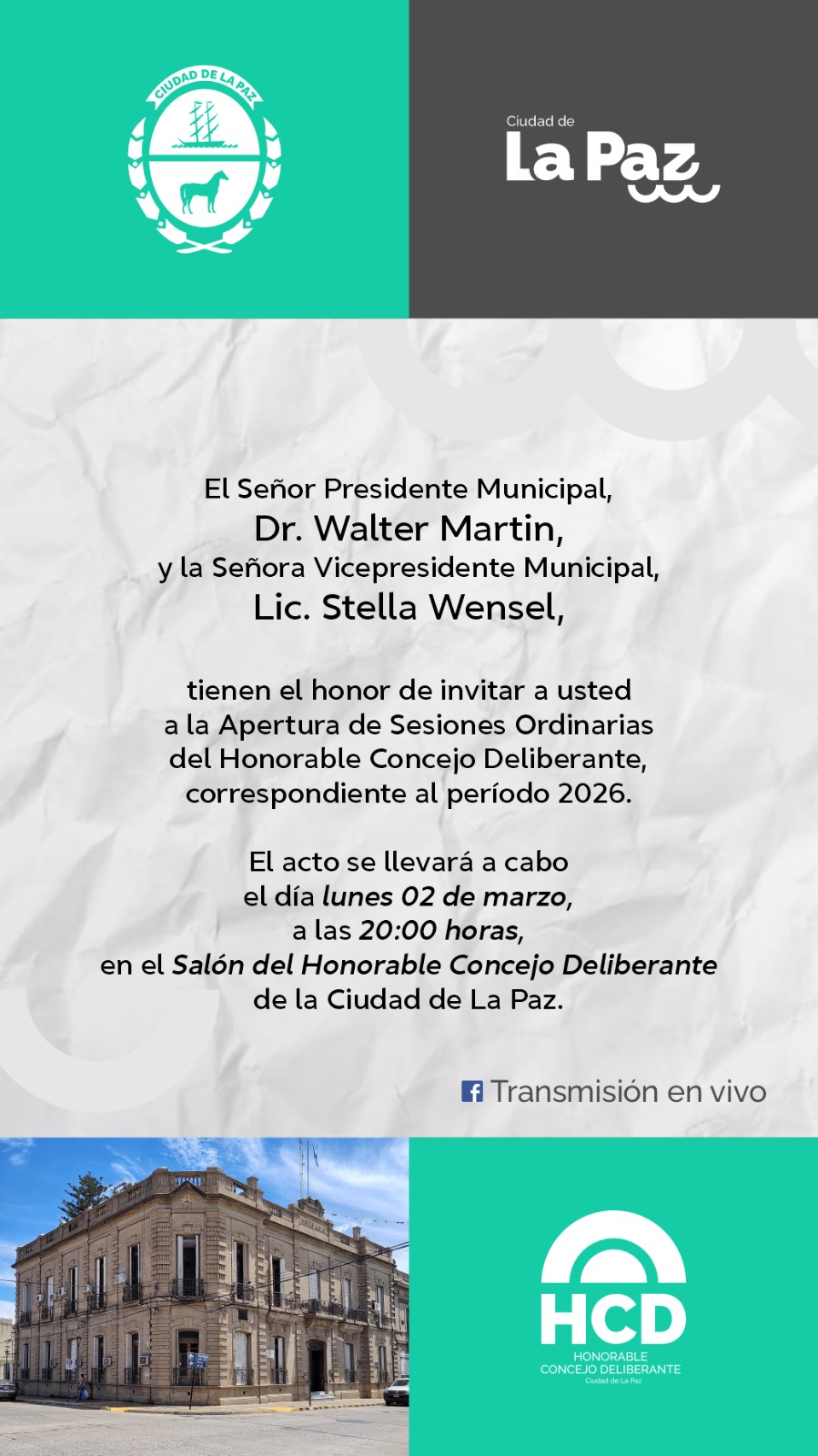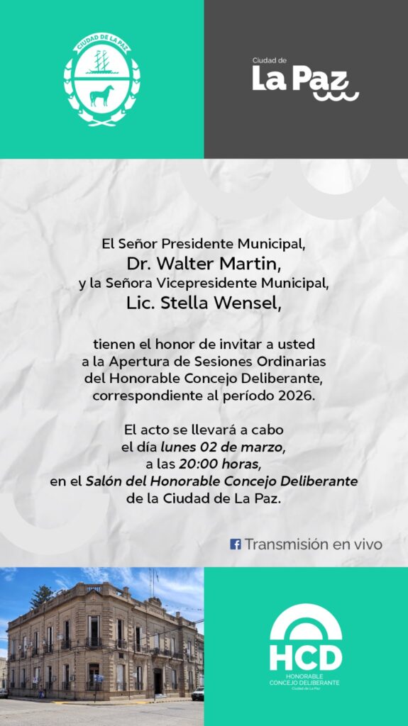 El intendente de La Paz, Walter Martin, encabezará este lunes 2 de marzo la Apertura de Sesiones Ordinarias 2026 del Honorable Concejo Deliberante, en un contexto económico complejo que obliga a redoblar esfuerzos en la administración de los recursos públicos. La sesión será transmitida en directo a través de cabales oficiales.
