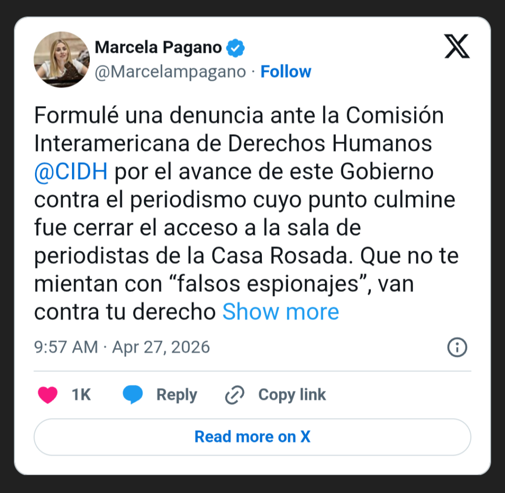 Este lunes, la diputada Marcela Pagano formuló una denuncia ante la Comisión Interamericana de Derechos Humanos (CIDH) por el ataque del Gobierno al periodismo y la imposibilidad de la prensa acreditada de ingresar a la Casa de Gobierno. “Que no te mientan con ‘falsos espionajes’, van contra tu derecho a informarte”, señaló la legisladora.