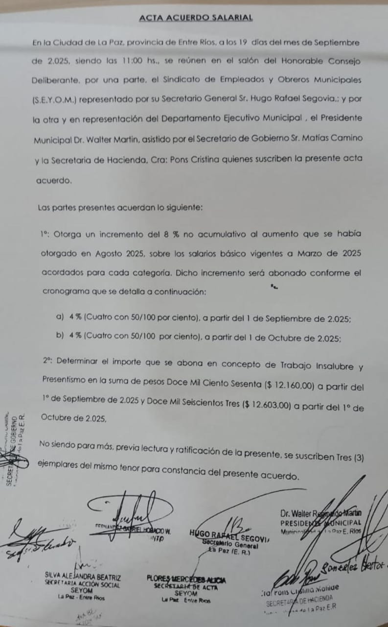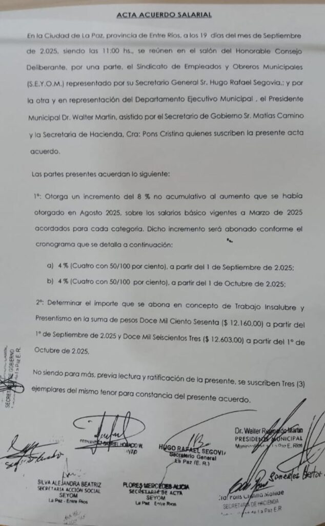 En representación del Sindicato de Empleados y Obreros Municipales (S.E.Y.O.M.), se reunió el secretario general Hugo Rafael Segovia con y el Presidente Municipal Walter Martin, asistidos por el secretario de gobierno Matías Camino y la secretaria de hacienda, Cra. Cristina Pons, todos suscribieron el acta acuerdo.
