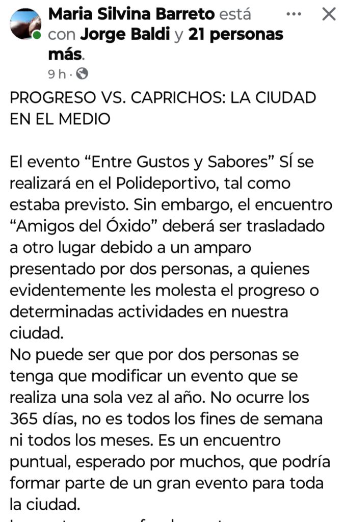Lamentamos comunicar que no se podrá Ilevar a cabo el encuentro de «Amigos del Óxido» junto a «Entre Gustos y Sabores» debido a que dos personas vecinas al polideportivo presentaron un recurso de amparo para que nuestro evento no se realice en dicho lugar.