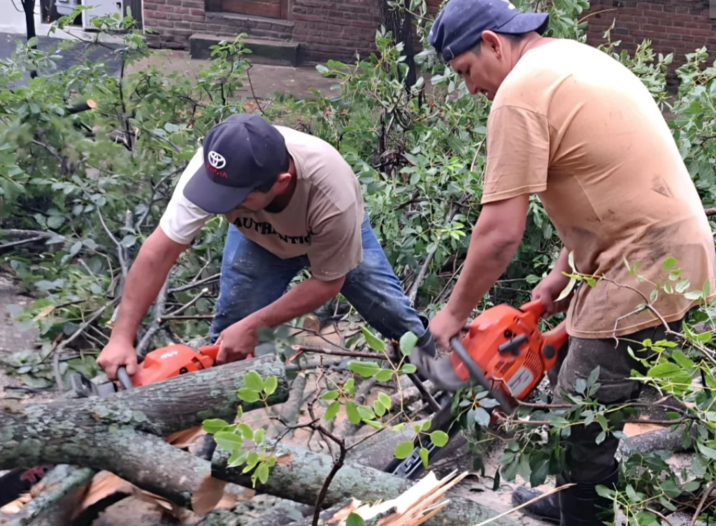 Luego de las intensas lluvias registradas en las últimas horas, personal municipal trabaja en distintos puntos de la ciudad para liberar zonas afectados por la caída de árboles y ramas de gran porte.