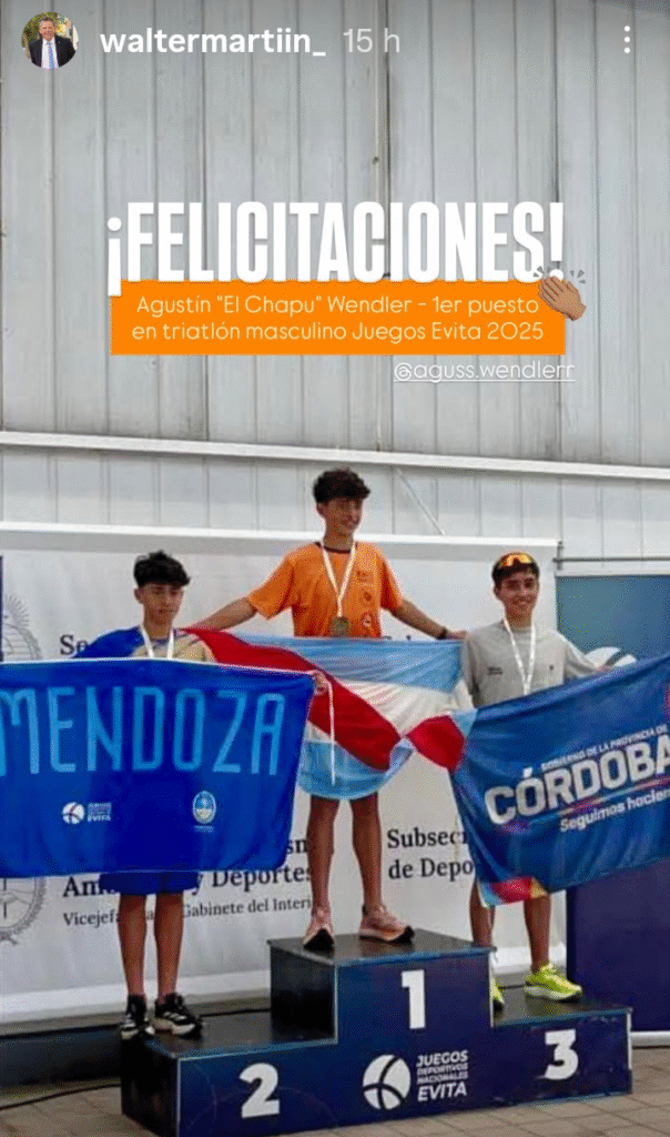 La actuación de Agustín Wendler Kosman, de La Paz, en la disciplina de triatlón, marcó un momento inolvidable al conquistar la medalla de oro en su tercera participación en los Evita. El joven deportista relató la intensidad de la competencia: «Vine a buscar lo que quería, necesitaba ganar. Hace mucho que lo venía entrenando y preparando junto a mi familia y mi entrenador Bruno Baldini. El año pasado ya me venía preparando y esta vez se dio, gracias al esfuerzo de todos».