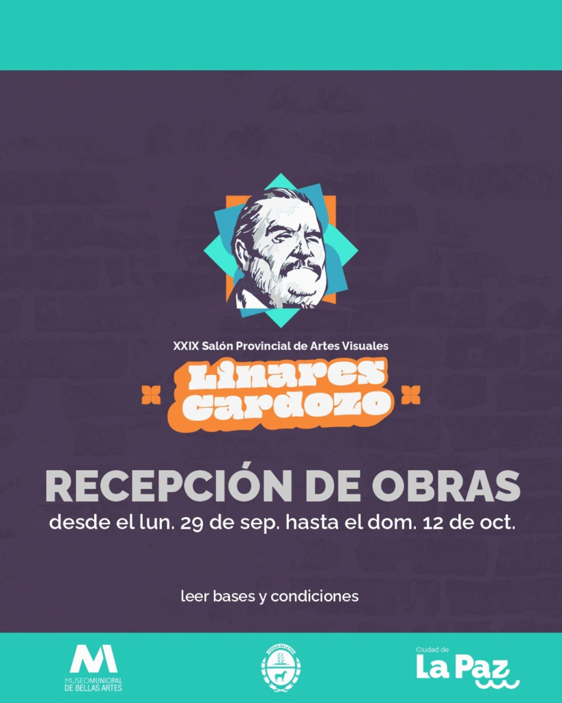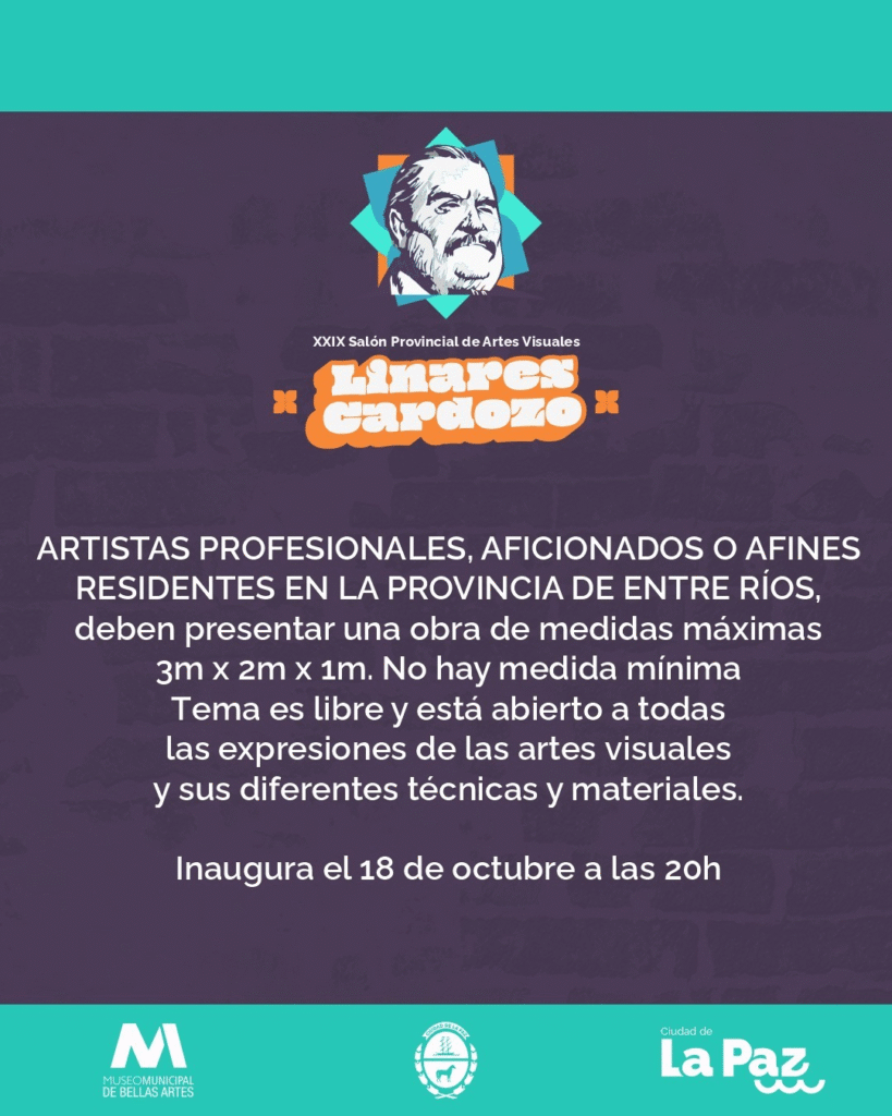 La Dirección de Cultura llevará adelante una nueva edición del Salón Provincial de Artes Visuales “Linares Cardozo”, que será inaugurado el 18 de octubre de 2025 a las 20:00 h en el Museo Municipal de Bellas Artes de La Paz.
