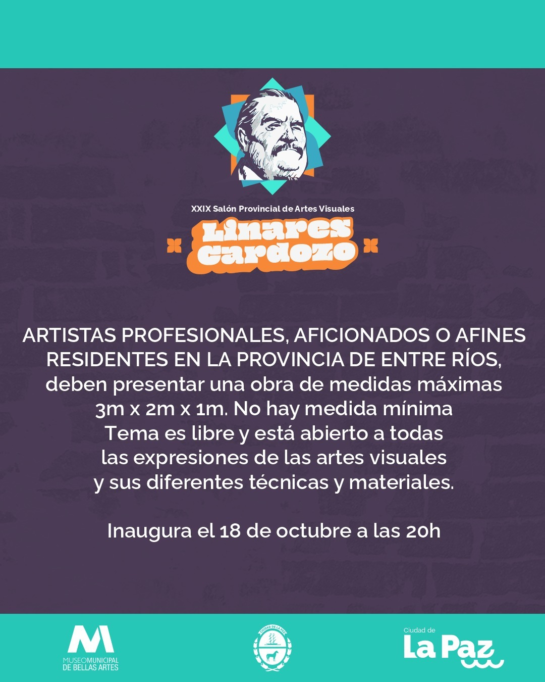 La Dirección de Cultura llevará adelante una nueva edición del Salón Provincial de Artes Visuales “Linares Cardozo”, que será inaugurado el 18 de octubre de 2025 a las 20:00 h en el Museo Municipal de Bellas Artes de La Paz.