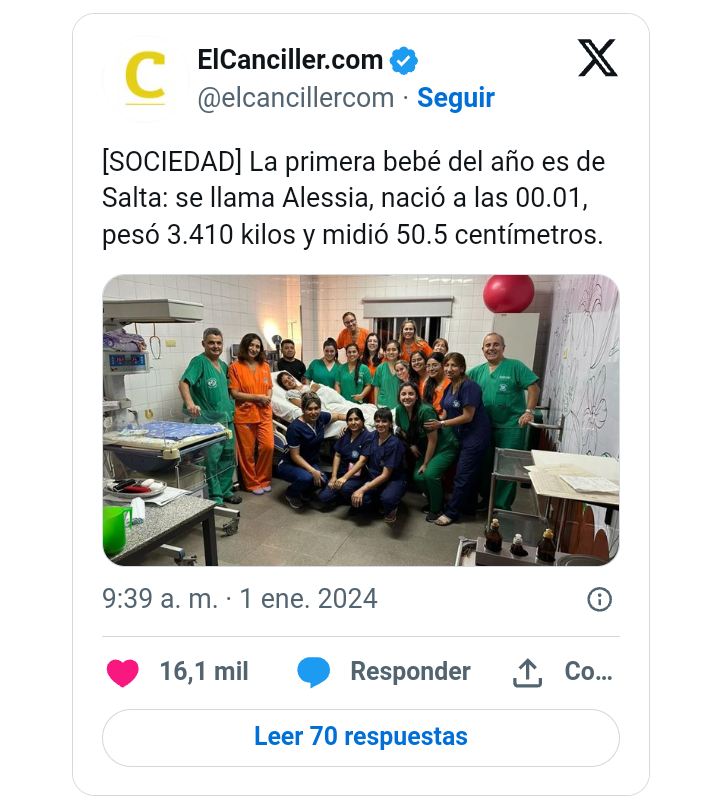 La beba nació a las 00.01 del 1 de enero de 2024. Pesó 3.410 kilogramos y midió 50.5 centímetros. Tanto la niña como su madre, María Belén, están en perfecto estado de salud.