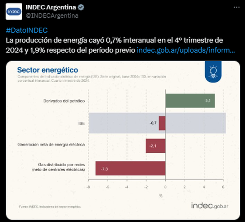 La producción de energía cayó un 0,7% interanual en el 4° trimestre del 2024 y un 1,9% respecto del período previo, según informó este miércoles el Instituto Nacional de Estadística y Censos (INDEC).