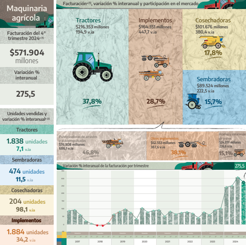 Este miércoles el Indec también dio a conocer el informe de maquinaria agrícolas. Durante el cuarto trimestre de 2024 alcanza una facturación de 571.904,1 millones de pesos, lo que representa un aumento de 275,5% en relación con el mismo trimestre de 2023.