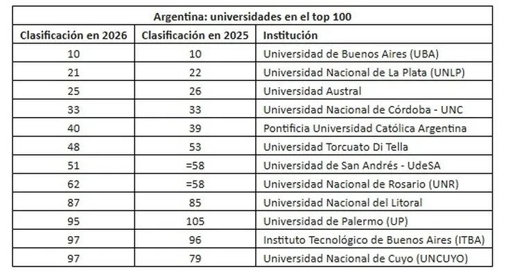 Pese a los problemas de recursos y el conflicto por el presupuesto, la UBA se mantiene en el top 10 y sostiene su posición respecto al año pasado, «lo que demuestra su resistencia ante los retos de financiación», detalla el informe publicado este miércoles de la nueva edición del QS World University Rankings 2026: Latinoamérica y el Caribe, consolidando su prestigio regional e internacional pese a los desafíos que enfrenta el sistema universitario argentino.