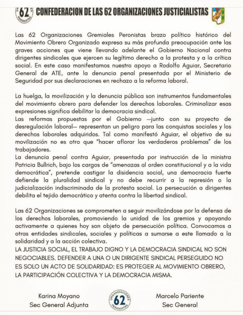 La histórica Confederación de las 62 Organizaciones Justicialistas expresó una “profunda preocupación” por las acciones del Gobierno Nacional contra dirigentes gremiales. Ratificaron su apoyo a Rodolfo Aguiar, titular de ATE, tras la denuncia penal presentada en su contra por criticar la reforma laboral.