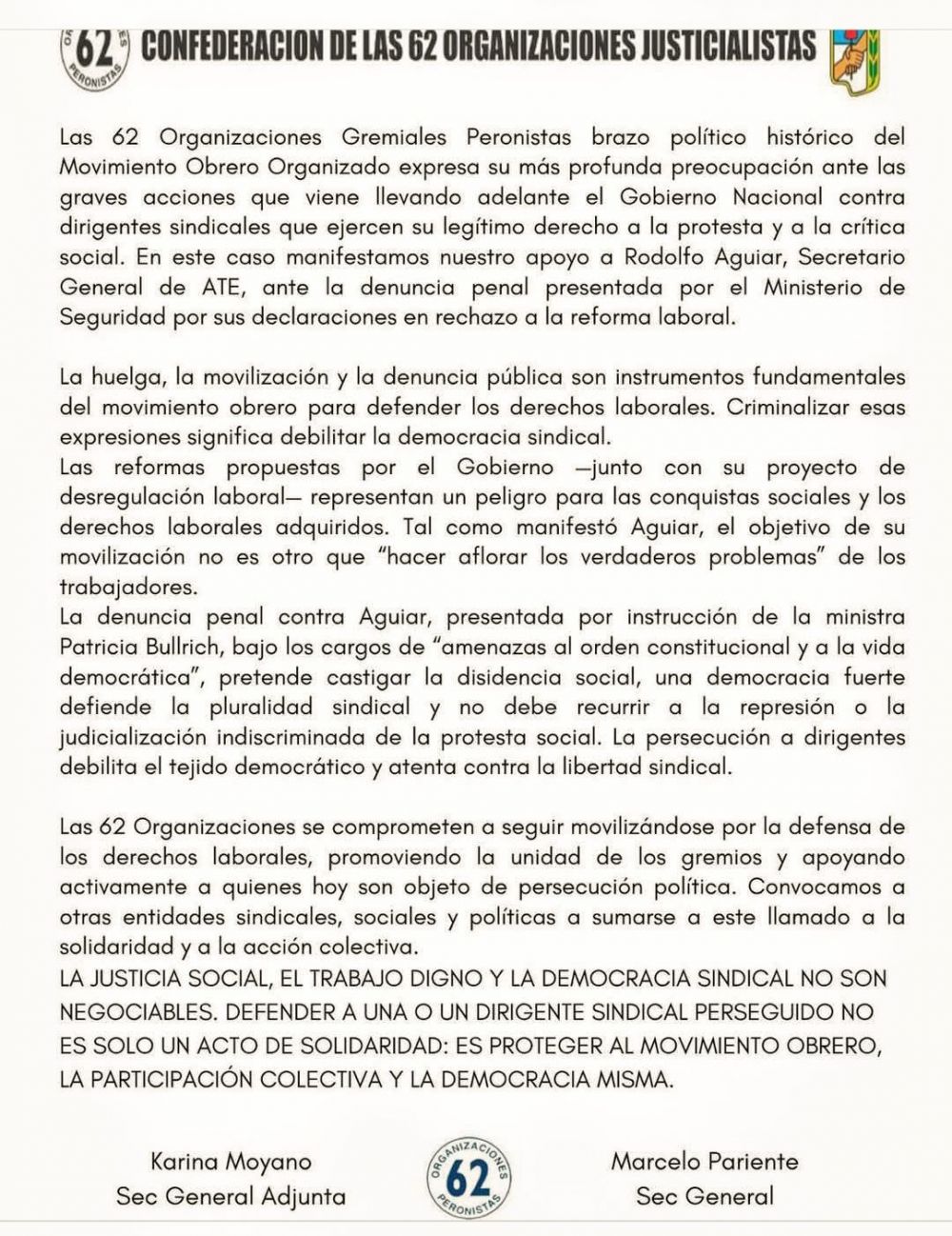 La organización remarcó que la huelga, la movilización y la denuncia pública son herramientas esenciales para la defensa de los derechos laborales, y advirtió que criminalizar estas expresiones significa “debilitar la democracia sindical”. Las 62 Organizaciones señalaron que las reformas promovidas por el Gobierno —enmarcadas en un proyecto más amplio de desregulación laboral— constituyen “un serio peligro para las conquistas sociales y los derechos adquiridos”. Recordaron, además, que según Aguiar, el objetivo de las protestas es “hacer aflorar los verdaderos problemas de los trabajadores”. La denuncia presentada por instrucción de la ministra Patricia Bullrich, bajo cargos de “amenazas al orden constitucional y a la vida democrática”, fue cuestionada por la entidad, que sostuvo que se trata de un intento de castigar la disidencia social.
